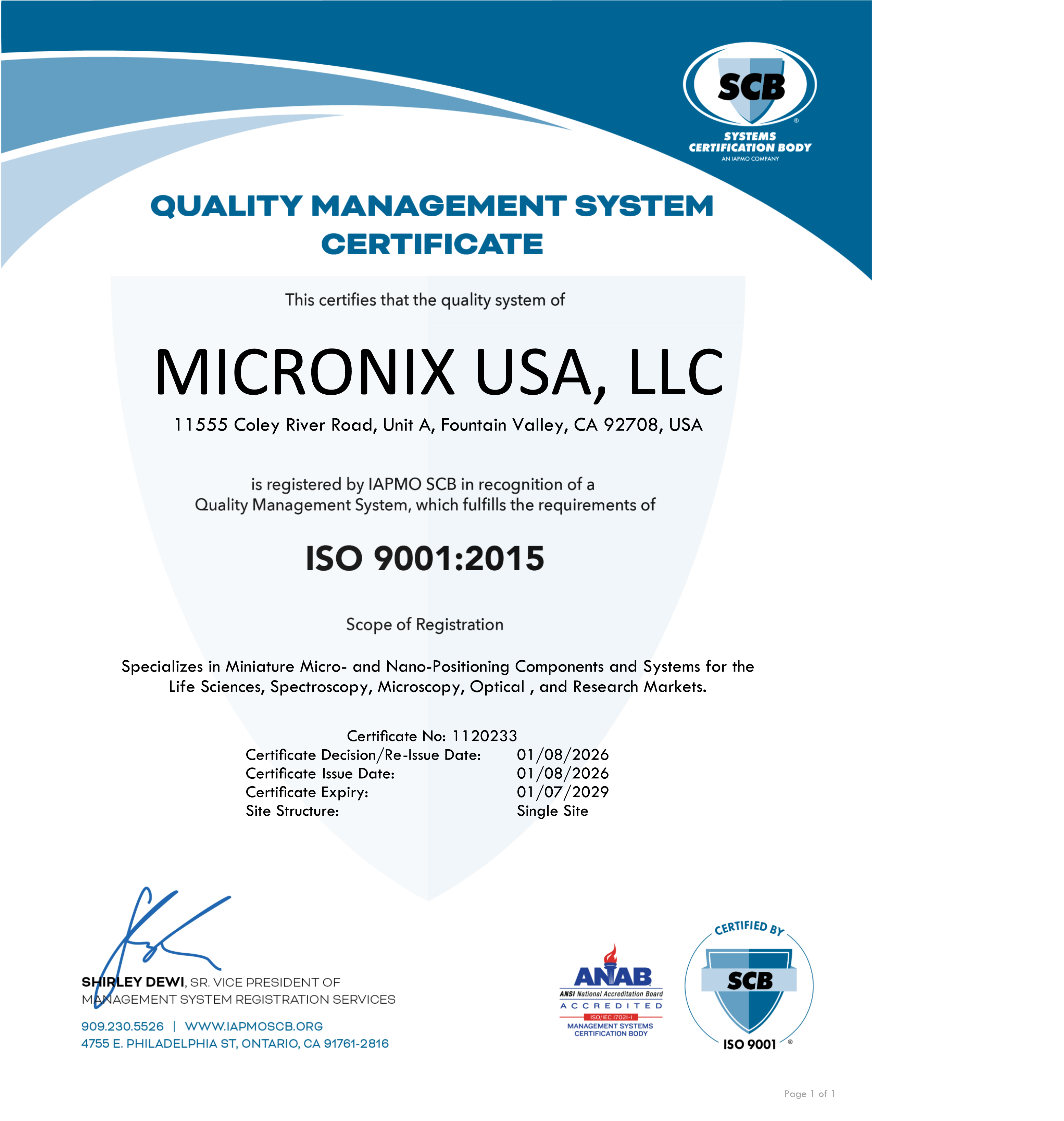 Founded in 2006 in Southern California, MICRONIX USA designs and manufactures miniature micro- and nano-positioning components and Systems for life science, spectroscopy, microscopy, optical, and research applications, including laser technology, telecommunications, semiconductor manufacturing and metrology, and micro-manipulation. We specialize in piezo positioners based on patented stick-slip motor technology and remain the only U.S.-based company that designs and manufactures miniature positioners using this principle.